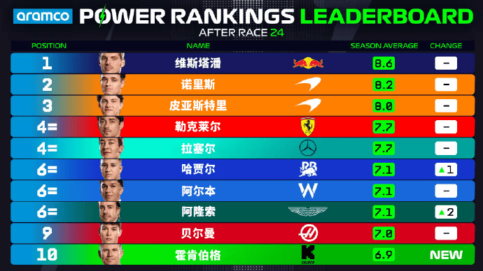 总榜上,维斯塔潘也以8.6的平均分在本赛季排名所有车手的榜首,领先于两位迈凯伦车手;哈贾尔与阿隆索位置上升,霍肯博格重入前十。