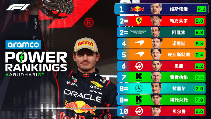 虎扑12月11日讯F1第24站——阿布扎比大奖赛的赛后PowerRankings发布,分站冠军马克斯-维斯塔潘获评9.6分排名单站第一。